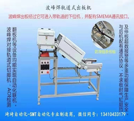 波峰焊出板后進(jìn)入自動(dòng)切腳機(jī)或AOI、翻板機(jī)等在線通訊均能實(shí)現(xiàn)自動(dòng)化聯(lián)機(jī)